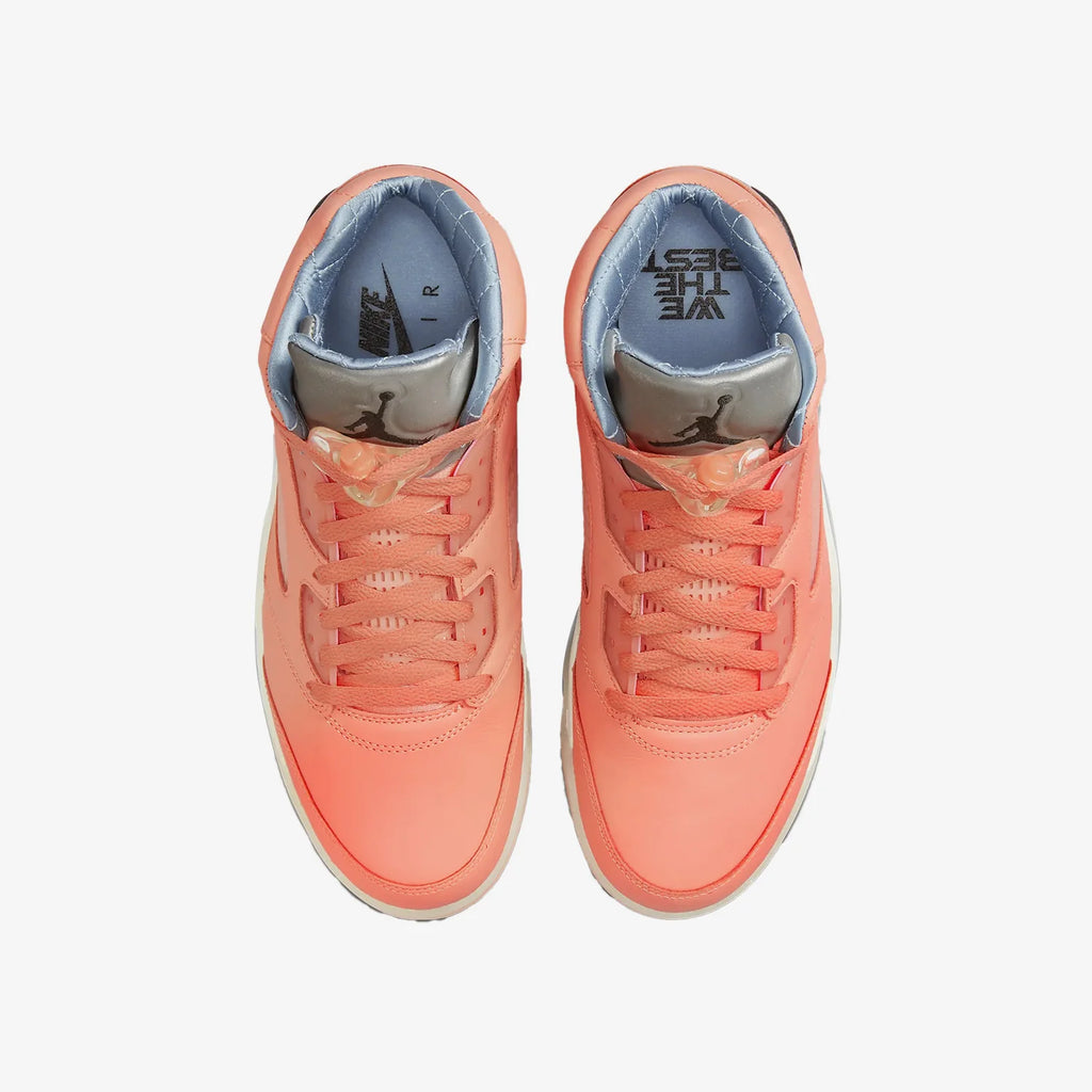 O Air Jordan 5 foi o primeiro tênis Jordan a ser vendido globalmente, marcando a expansão internacional da marca. Seu design foi inspirado em aviões de caça da Segunda Guerra Mundial, com detalhes que remetem a cockpits e asas. Este modelo foi usado por Michael Jordan durante momentos históricos de sua carreira, incluindo seu famoso "The Shrug" nas finais de 1991.